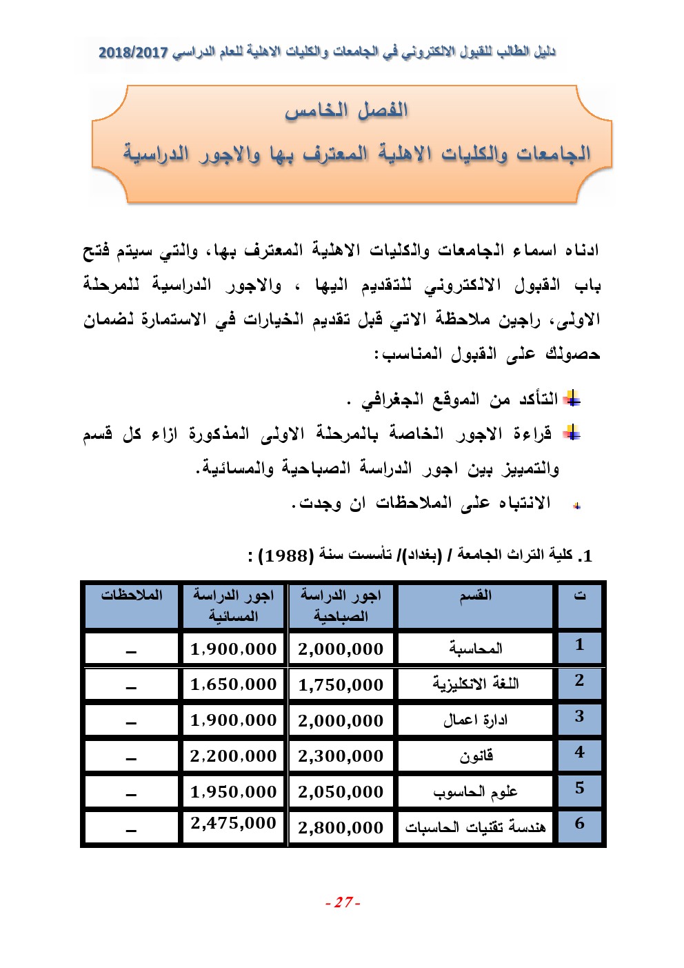 الاجور الدراسية الاقساط للجامعات والكليات الاهلية المعترف بها في العراق 2017 2018
