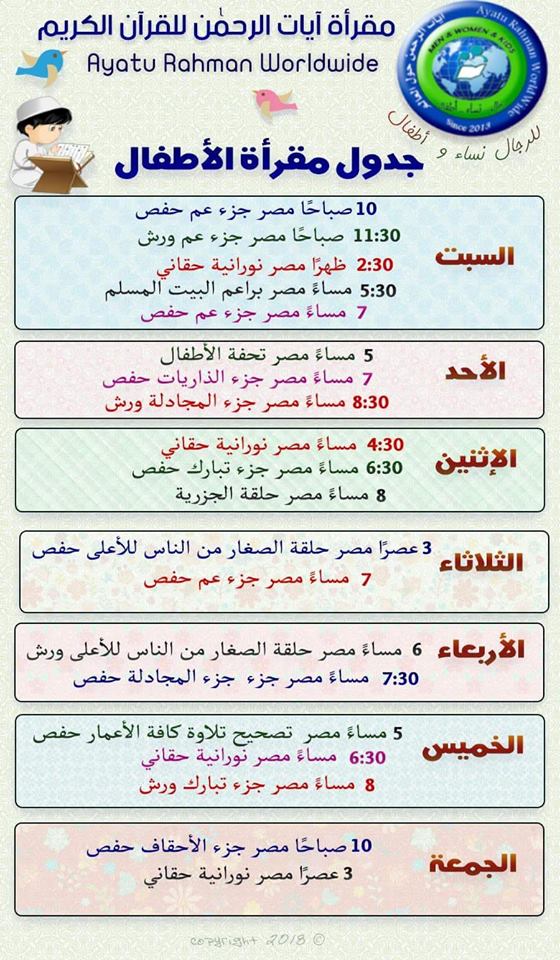 مقرأة آيات الرحم ن للرجال والنساء والأطفال حول العالم بكل اللغات الجدول الشتوي لمقرأة الطفال 2018 2019